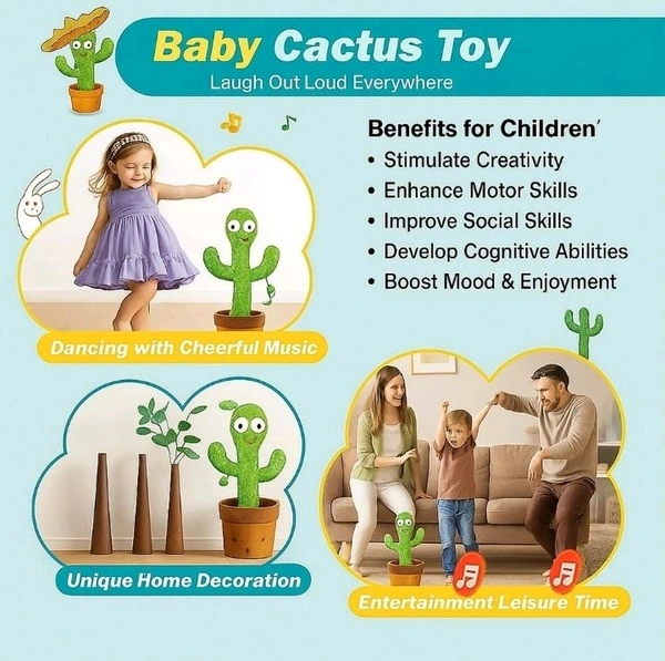 "The Talking Cactus That Mimics Every Word You Say!" (Focus on the fun part) "Instant Smiles: The Only Toy That Dances, Sings, and Talks Back!" "Stop the Crying, Start the Dancing! The Perfect Buddy for Your Toddler." "Upgrade Playtime: 120+ Songs & Hilarious Mimicry in One Cute Cactus." "No More Batteries! New USB Rechargeable Dancing Cactus is Here."
